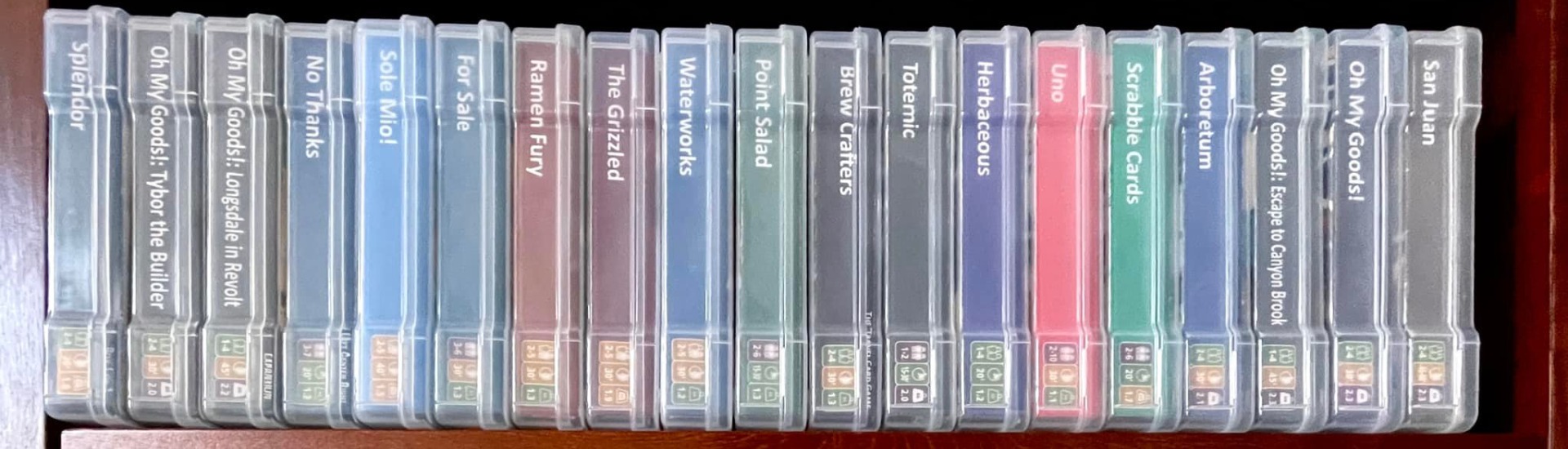 One of the cool parts of storing photo cases, whether in the storage box or on the shelf is that their spine faces outward. This makes it a perfect place to give information about the game in the photo case. The name is an obvious place to start, but including player count, playtime, and weight make it very easy to survey a huge swath of games quickly to find the perfect game or two for game night.